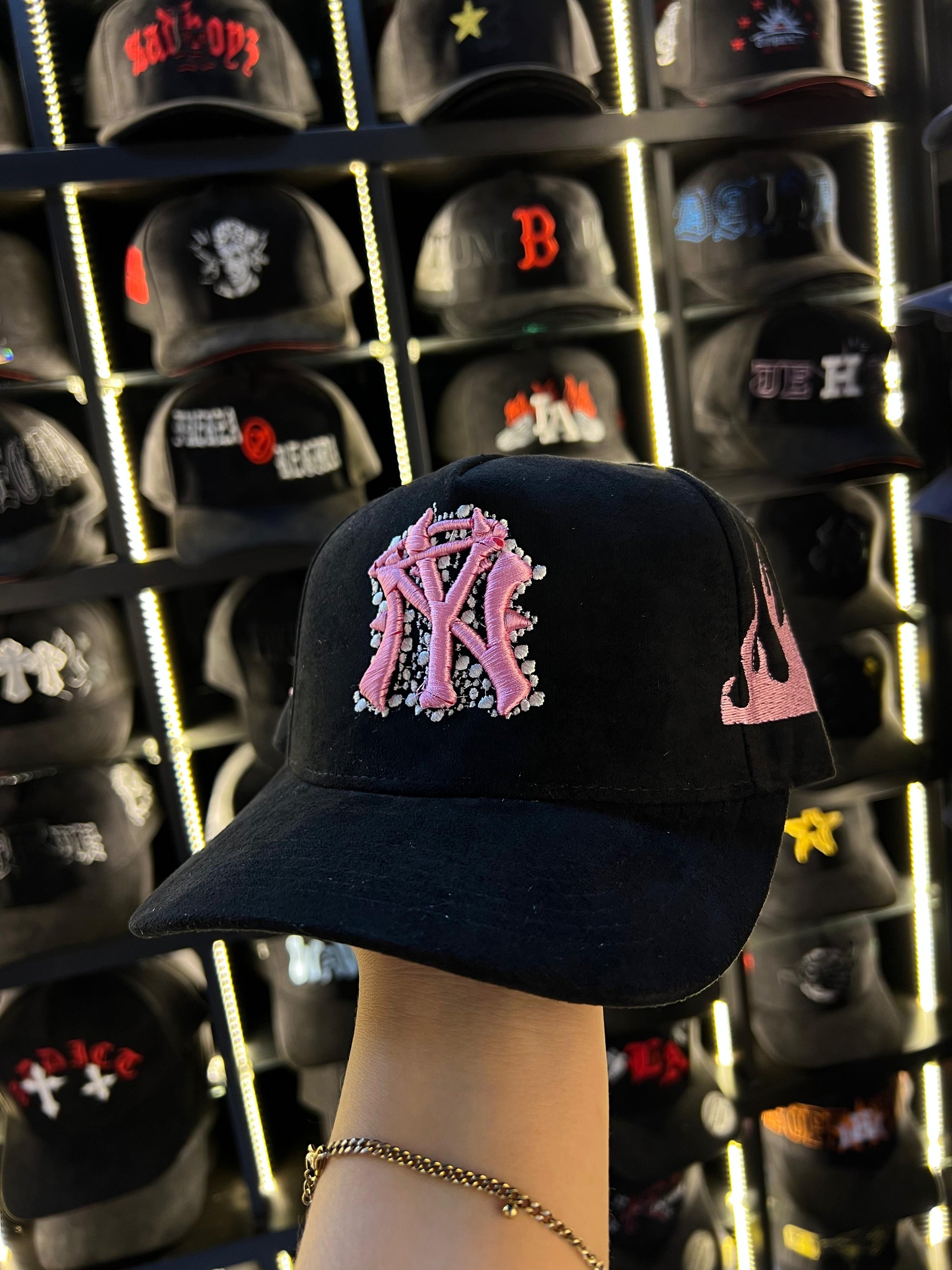 Esta gorra en negro intenso lleva un bordado rosa vibrante con pedrería brillante que grita glam y poder. El diseño en llamas y el logo estilo NY son puro fuego visual para quienes dominan su espacio con clase y flow.