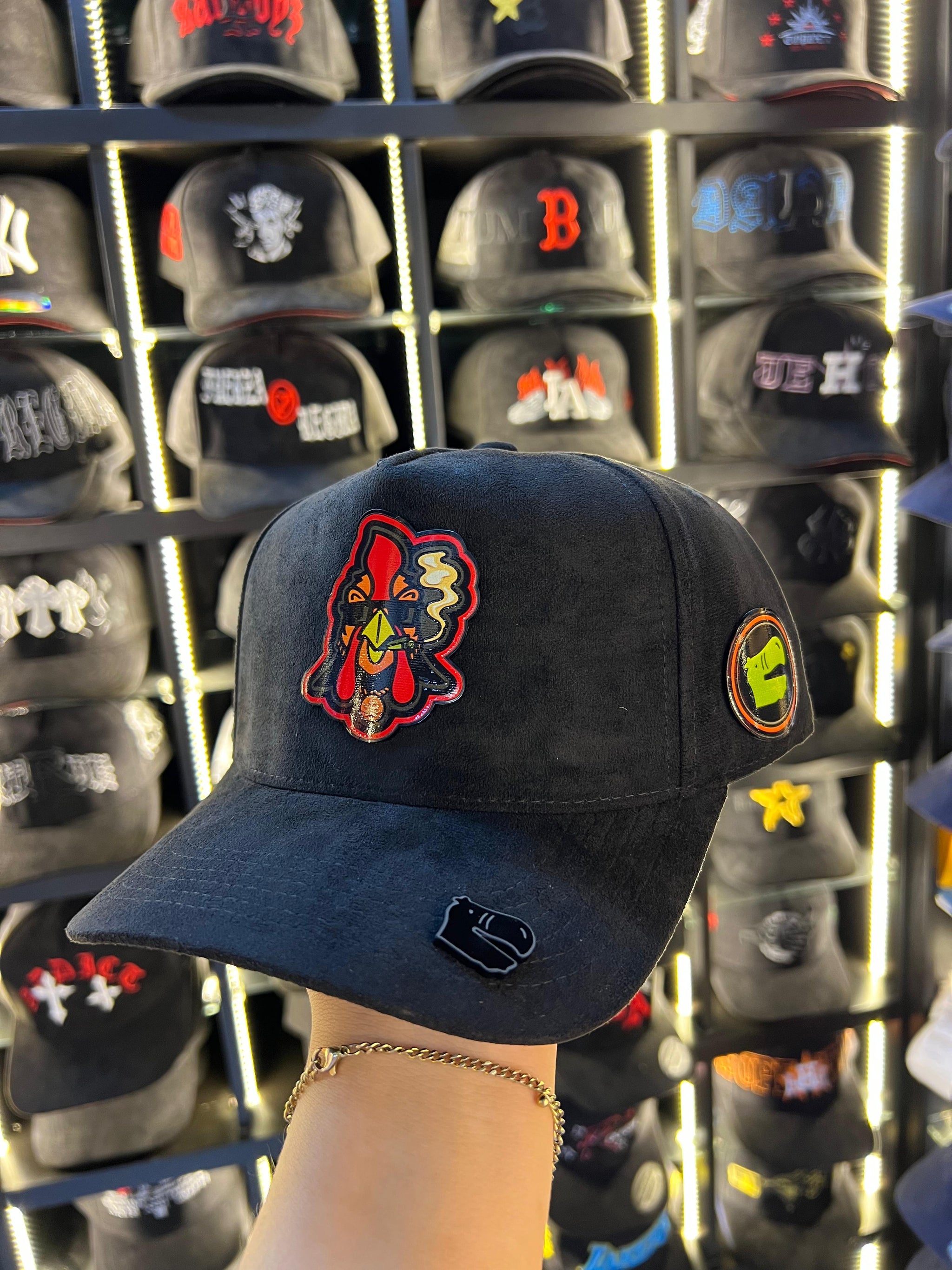 Esta gorra negra lleva al frente un gallo imponente, símbolo de honor, fuerza y orgullo de rancho. Con detalles bordados tipo parche y apliques estilo urbano, es perfecta para los que caminan con respeto y mirada al frente.